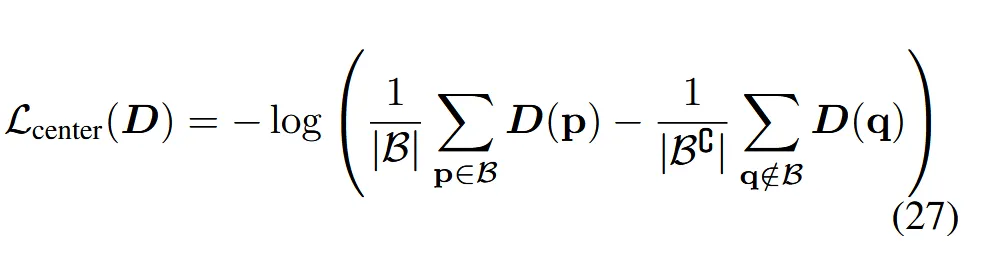 렌더링된 뷰의 중앙과 테두리 픽셀 depth를 비교해, 화면 중심에 물체가 오도록 끌어당기는 손실 함수입니다. D는 depth image, B는 중심 이미지의 box(pixel 위치), 는 B의 complement입니다.