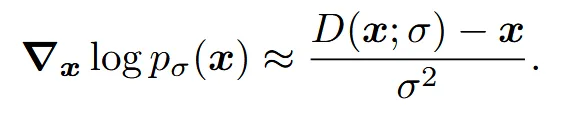 에 표준편차 의 gaussain 노이즈를 더한 분포를 라고 정의합니다. 학습된 denoiser(D)는 denoising score(위의 식)을 잘 근사합니다.