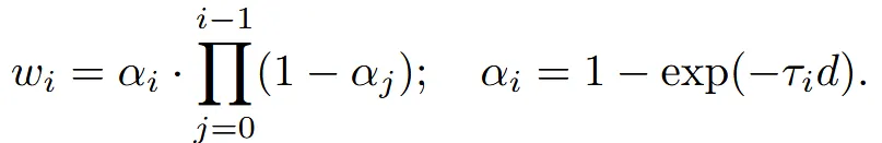 각 샘플의 weight 값은 alpha-composited를 이용해서 위와 같이 구합니다. 간단히 설명하면 픽셀의 불투명도(alpha)에 따라서 가중치가 결정됩니다. τi는 그 지점의 density 값을 나타냅니다.