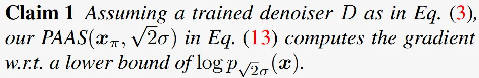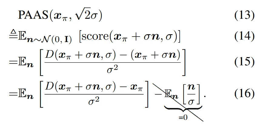 직관적인 방법을 사용했을 경우 전혀 새로운 분포이기 때문에 잘못된 결과가 나오는 것을 확인했습니다. 따라서 우리는 우리가 학습한 분포로 변환하기 위해 적절한 크기의 노이즈()를 더하고, denoiser가 예측한 score를 여러번 샘플링하여 평균을 내면 노이즈 효과가 사라지면서 우리가 원하는 데이터를 얻을 수 있습니다. 이 과정을 Perturb-and-Average Scoring (PAAS)라고 합니다.