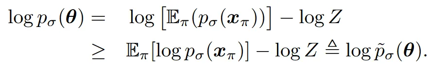 Z는 정규화 상수로서 비례를 부등호로 바꿔주는 역할을 합니다. 이후에 마지막 줄(크거나 같다 부등호 있는 줄)로 바꾸기 위해서 우리는 Jensen’s inequality를 활용합니다. 쉽게 평균을 취한 뒤 log를 씌우는 값이, log를 씌운 뒤 평균을 내는 값 보다 항상 크거나 같다는 것 입니다.