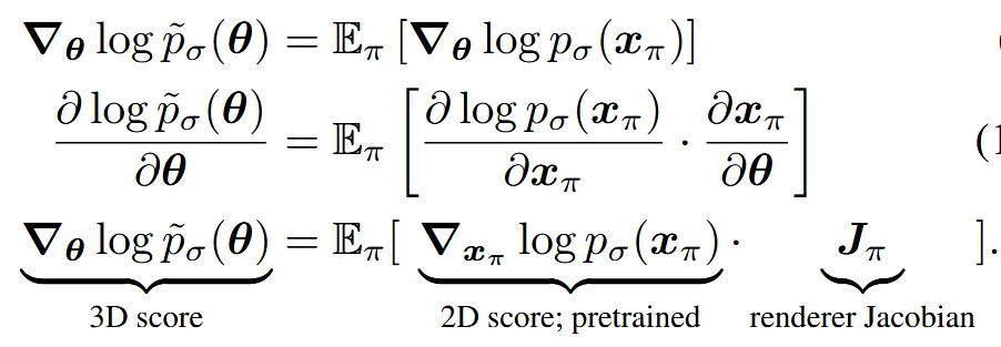 Chain rule에 의해서 3D denoising score는 2D denoising score에 Jacobain render를 곱해주는 결과와 같다는 것을 수학적으로 증명한 것입니다. 간단하게 생각하면, 3D의 score를 학습하기 위해서 결국 2D score를 학습하면 된다고 보시면 됩니다.