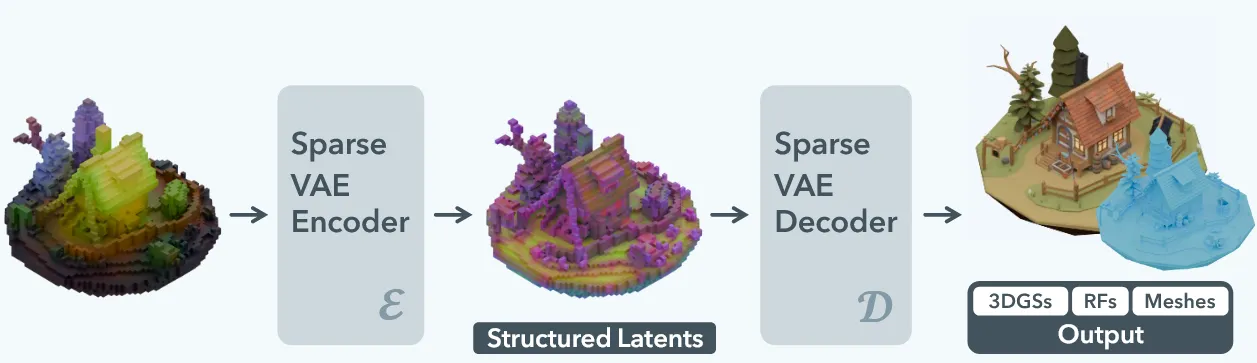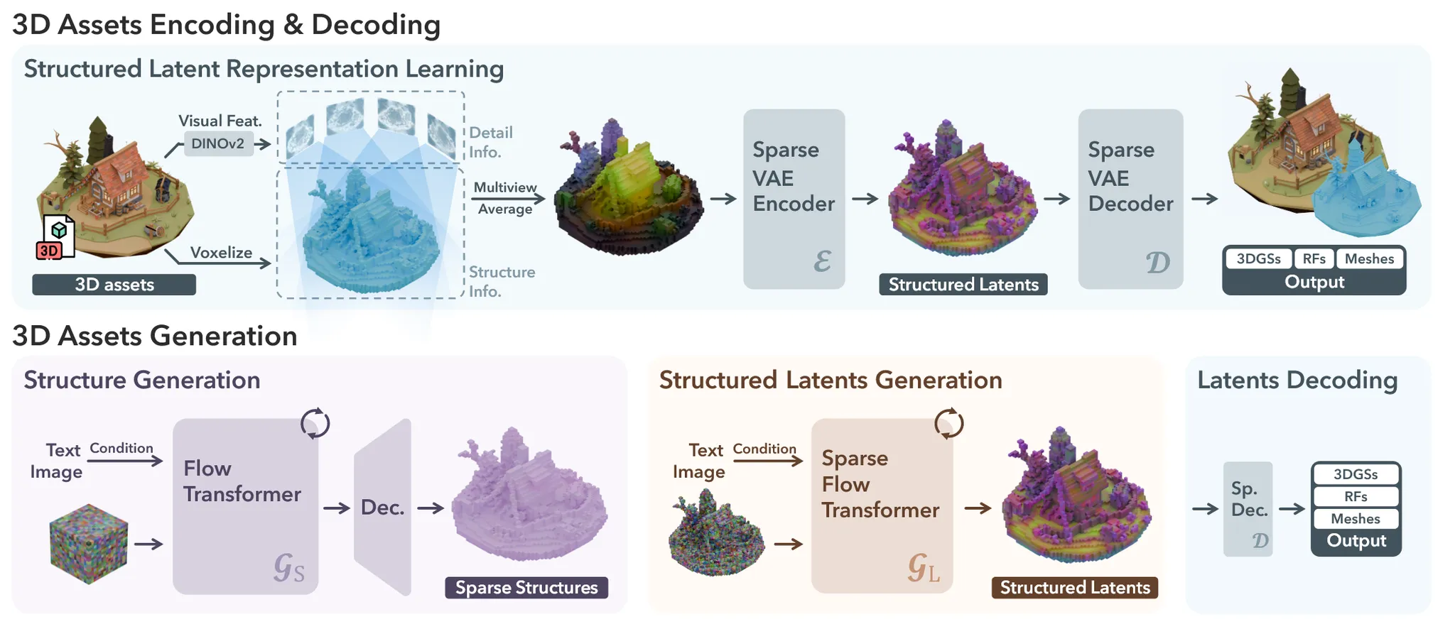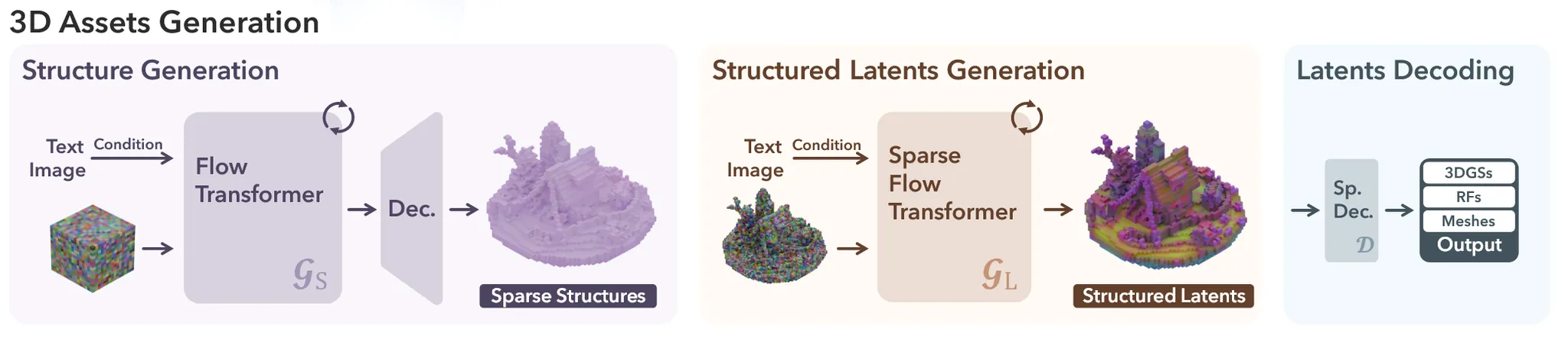 Image나 Text가 들어왔을 때 다양한 형태(NeRF, 3D GS, asset)로의 변환이 가능한 모델인 Trellis의 아키텍처는 위와 같습니다.