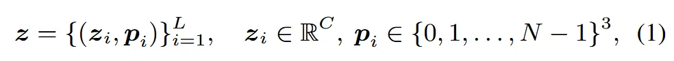 조금 더 자세히 설명해드리자면 3D asset을 3D grid로 나눈 뒤, 표면과 교차하는 voxel만을 L개 선택합니다. L개의 voxel들은 각각 어떤 grid에 속하는지에 대한 인덱스 와 encoder를 통과한 후 latent 값인 를 갖도록 변환됩니다(encoder는 아래 단락에서 설명). 인덱스는 0~N-1까지 총 N개의 grid중에서 어떤 grid에 속하는지를 나타내고, latent 값은 기하학적인 정보와 형태 정보를 모두 저장하고 있습니다.