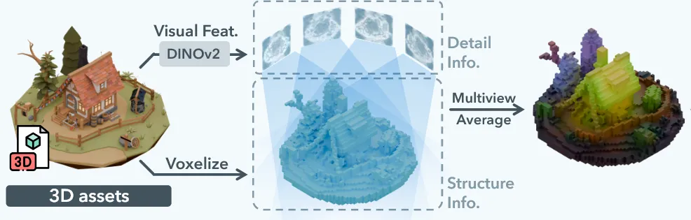 우선 3D asset을 voxelized feature 로 변환하는 방법에 대해서 설명해드리겠습니다. 여기서 말하는 는 이전에 설명드린 active voxels로 L개의 voxel들입니다. 를 추출하기 위해서 랜덤한 카메라 뷰에서 렌더링한 이미지를 DINOv2를 이용해서 feature를 추출한 다음, 이를 평균내서 구합니다. 의 해상도는 structured latents z의 해상도와 동일하게 이고, 각각의 는 기하학적인 정보와 외양 정보를 담고 있습니다.