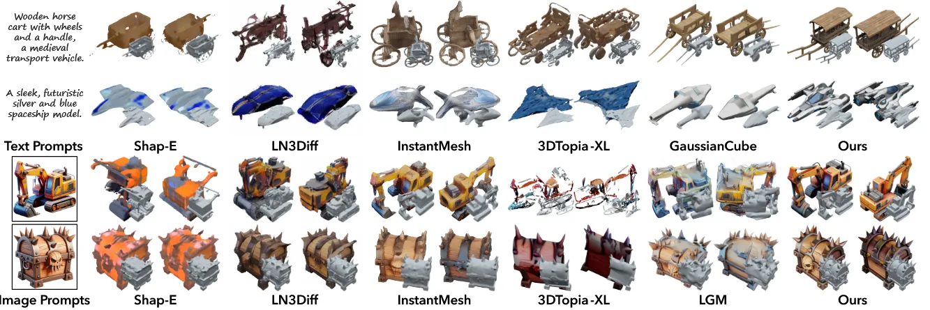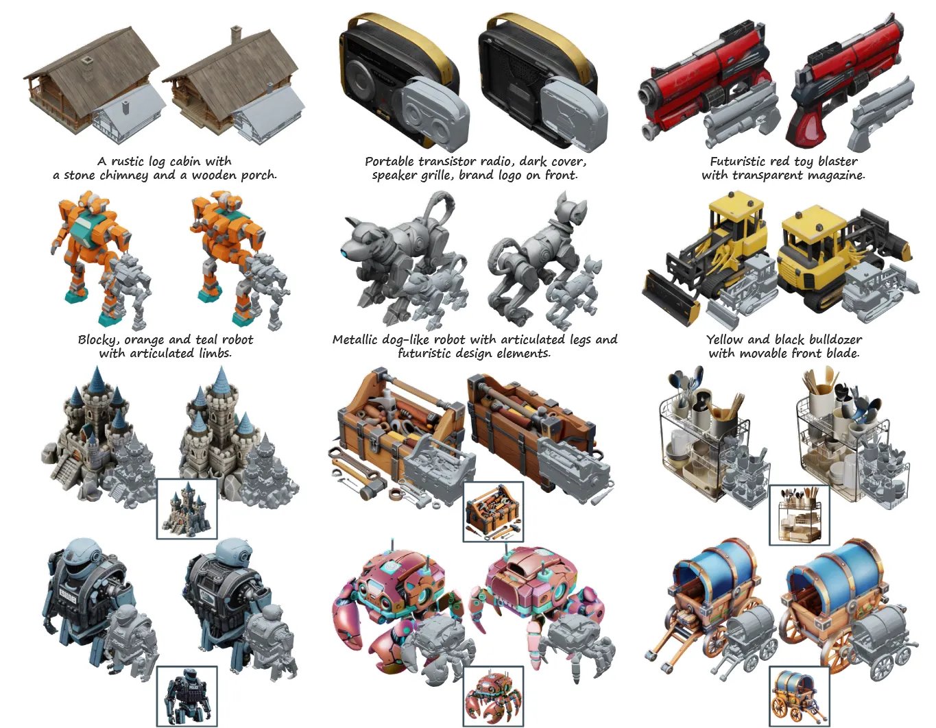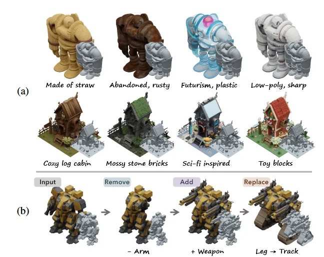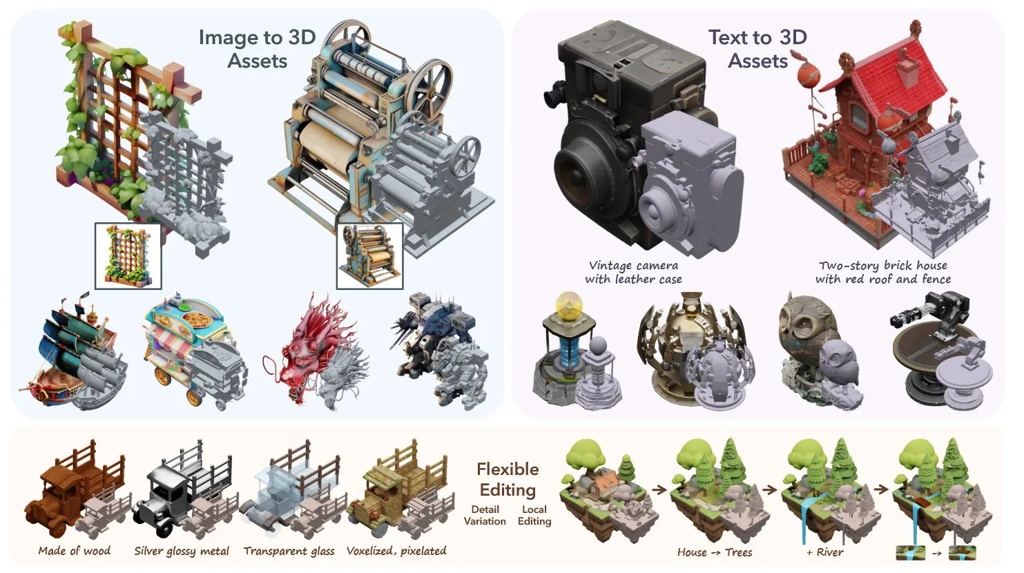 2025 CVPR Spotlight를 받은 마이크로소프트에서 만든 Trellis 논문입니다. 위의 그림에서 볼 수 있는 것처럼 Image, Text로부터 10초만에 3D를 생성할 수 있고, 아래 부분처럼 자연스러운 3D editing도 가능하다고 언급했습니다. 어떻게 이를 가능하게 했는지 한번 살펴보도록 하겠습니다.