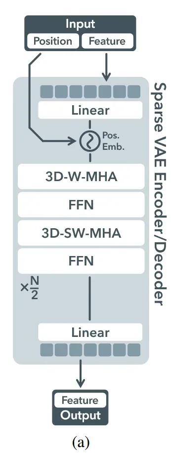 Encoder-Dcoder 구조는 transformer와 동일한 것을 그림을 통해서 확인할 수 있습니다. 희귀한 voxel들을 다루기 위해서 입력 voxel에 positional encoding을 추가하고, local information을 다루기 위해서 shifted window attention도 추가했습니다. 학습은 reconstruction loss와 에 대한 KL-penalty를 함께 두어서 end-to-end로 진행합니다.