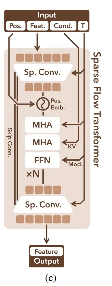 이전에 생성한 sparse structure의 active voxel index 를 이용해서 time step t시점에서의 denoising을 진행하는 과정은 위의 그림과 같습니다. 이전처럼 condition과 timestep은 동일하게 포함되고, 단지 여기에 active voxel index의 값만 positinal encoding을 통해서 추가적인 정보로 사용된다고 보시면 됩니다. 위의 그림에서 Feat는 t시점의 토큰 상태이고, sparse strucutre를 통해서 L만큼의 가우시안 노이즈 토큰을 생성해서 이로부터 디노이징 한다고 생각하시면 됩니다. Sparse convolution의 첫번째 downsample은 인접한 2x2x2 지역을 하나의 voxel로 묶고, 두번째 upsample은 원래의 크기로 복원하기 위해서 학습 가중치를 이용합니다.