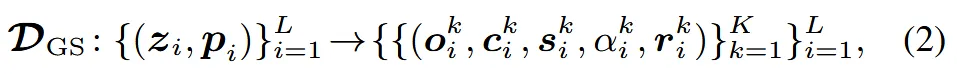 3D GS Decoder의 loss는 위와 같습니다. 각각의 latent 는 K개의 gaussain으로 변환되는데 이때 각 gaussian은 위의 수식과 같이 (o: offset, c: color, s:scale, : opacity, r: rotation)으로 이루어져있습니다. 최종적으로 L개의 voxel들이 존재하기 때문에 L X K개의 gaussian이 존재하고, 각 gaussian의 중심점 로 voxel에서 약간의 offset만큼만 변환되도록 설계 됐습니다. Reconstruction loss는 렌더링된 이미지와 실제 이미지 사이의 L1, D-SSIM, LPIPS로 구성되어 있습니다.