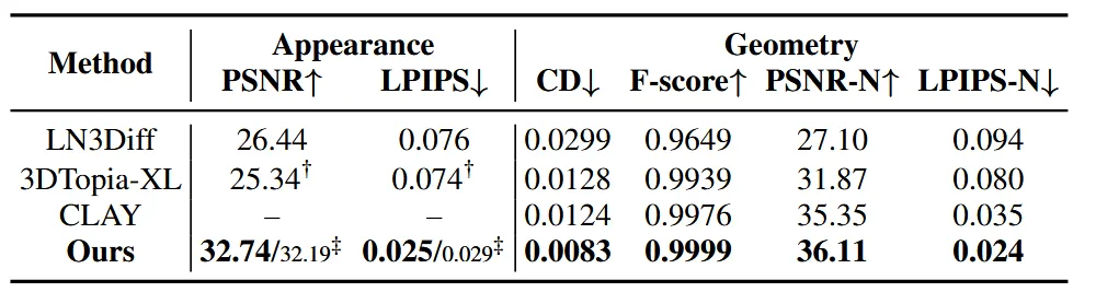 는 FlexiCubes에서 사용한 flexible 파라미터이고, 는 signed distance value입니다. 참고로 FlexiCubes는 Marching cubes 대신에 SDF값을 이용해서 mesh를 생성하는 방법으로 품질을 개선한 방식입니다. 마지막 결과에 upsampling block을 추가해서 최종적인 output의 해상도를 으로 설정했습니다. Loss로는 렌더링된 depth(normal)과 실제 값과의 L1 loss를 진행합니다.