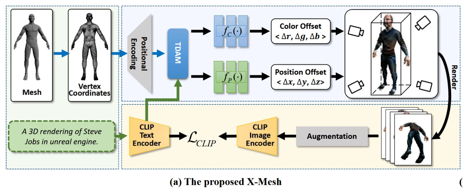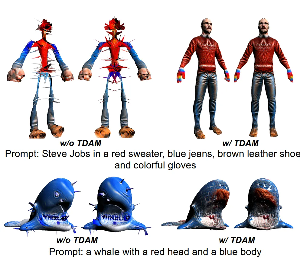 a가 일반적인 기존의 text기반의 3D 변형 모델이고, b가 해당 모델의 아키텍처입니다. MLP와 CLIP Loss에 의존할 경우 디테일을 살리지 못하는데 논문에서는 TDAM(Text-guided Dynamic Attention Module) 방식을 사용해서 빠른 속도로 디테일한 결과를 생성할 수 있도록 했습니다.