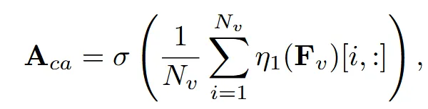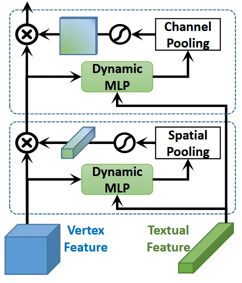 위의 그림을 다시 가져왔는데 아래 부분에서는 Spatial attention을 위의 부분에서는 Channel attention을 진행하는 것을 확인할 수 있습니다. Vertex Feature 의 차원은 인데 여기서 는 vertex의 개수, 는 vertex의 차원입니다. 여기서 주의해야될게 는 3차원이 아닌 positional encoding을 거친 결과 2C입니다.