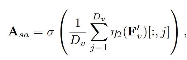 Channel Attention을 어떻게 하는지 먼저 확인해보도록 하겠습니다. 우선 spatial dimension을 average pooling을 진행해서 차원을 로 변환합니다. 이후 Sigmoid를 이용해서 값을 0부터 1을 갖도록 합니다. 설명한 과정이 위의 수식입니다.