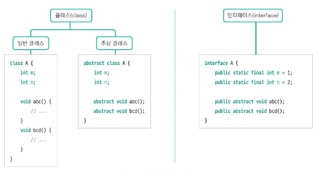 class 대신 interface 키워드를 사용해서 선언. 필드와 메서드에 제어자를 생략하면 컴파일러가 자동으로 제어자를 삽입해준다.