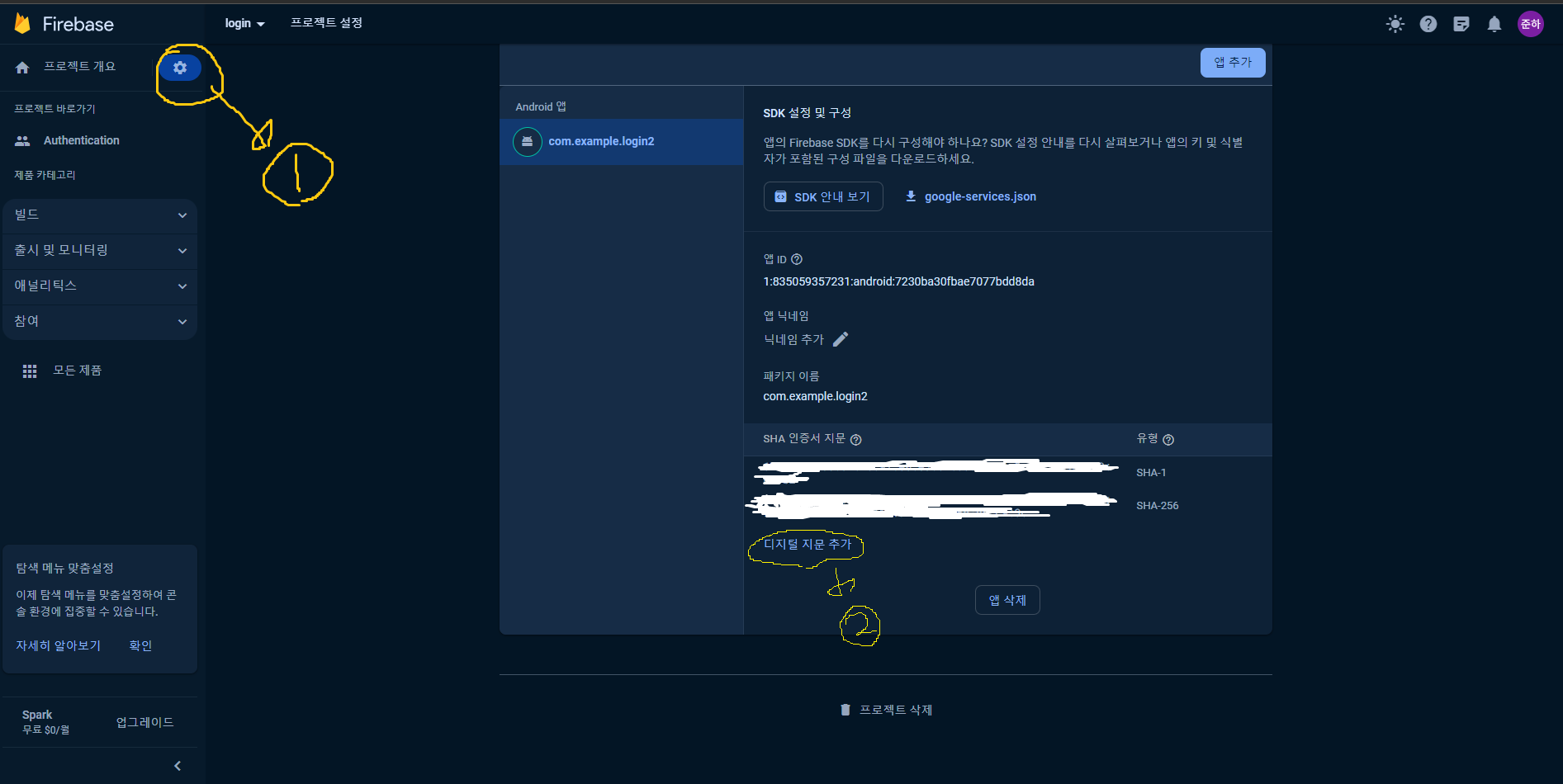 여기서 추가로 해줘야 할 것은 firebase에서 SHA-1, SHA-256 디지털 지문을 추가해줘야 한다