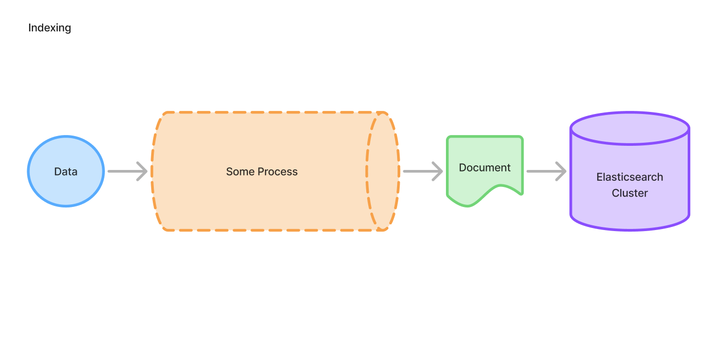이렇게 어떤 데이터를 Elasticsearch cluster에 추가하는 과정을 indexing(인덱싱)이라고 부릅니다. 앞서 말했듯이 RDB의 인덱싱과는 많이 다른 개념이기 때문에 주의해야 합니다. (cluster에 대한 자세한 설명은 여기서 생략합니다. 지금은 단순히, Elasticsearch 저장소에 검색 가능한 상태로 잘 저장되었다 라고 봐주시면 됩니다)