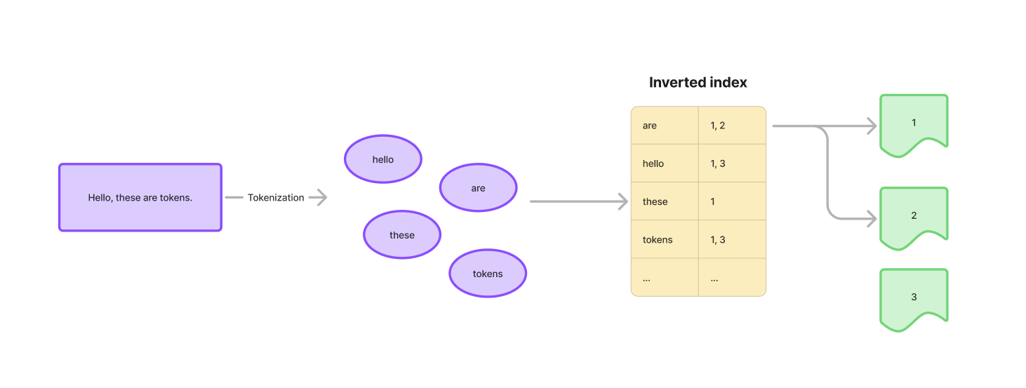 입력되는 문장을 의미를 가지는 최소 단위인 토큰(Token)으로 나눠서 이를 키(Key)로 저장합니다. 각 토큰은 해당 토큰을 포함하는 문서를 가리키는 값(+정확한 위치, 빈도 등 메타데이터)를 값(Value)로 가집니다.