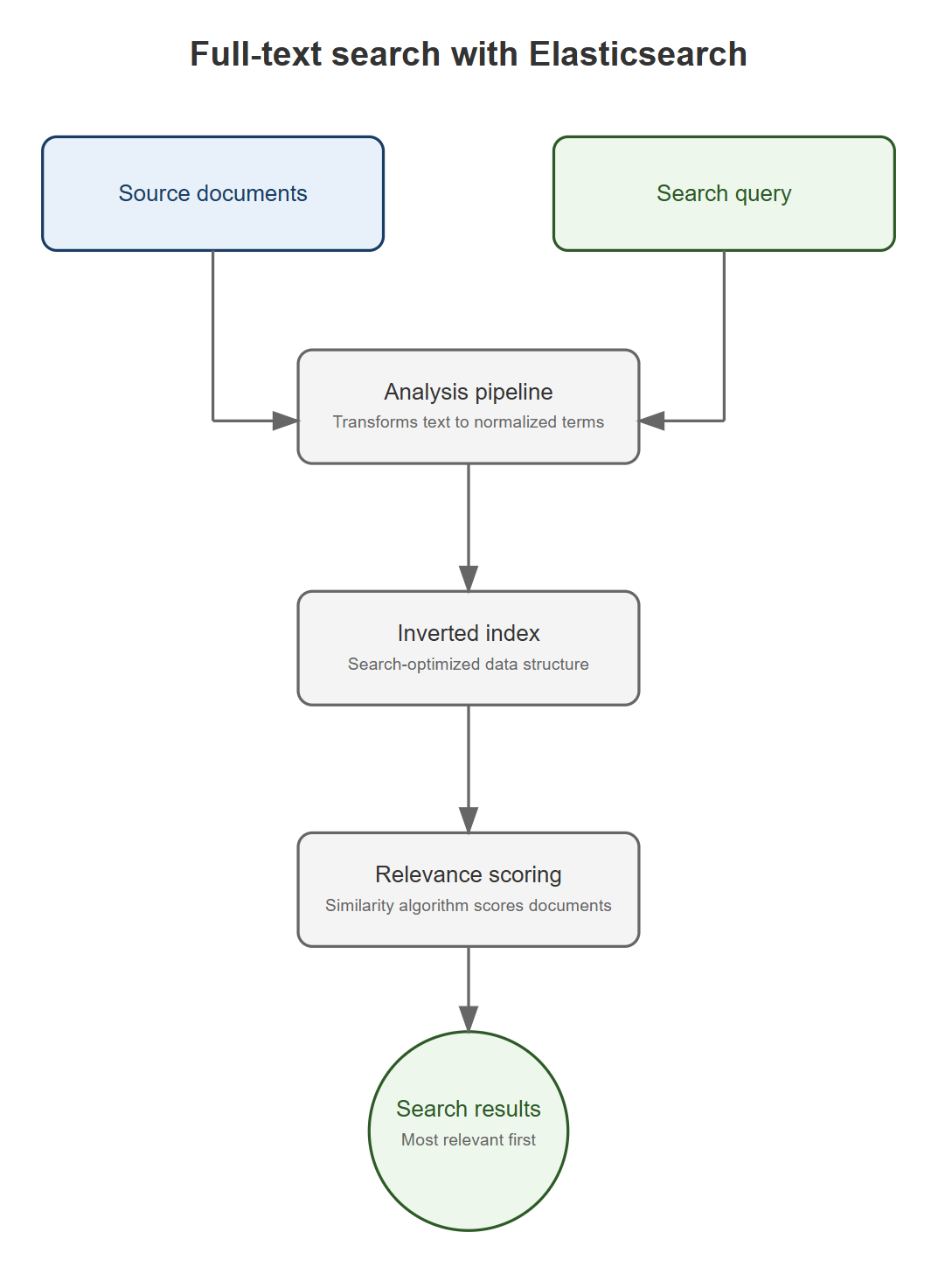 Elasticsearch에서는 Full-text search를 위한 저장과 검색에 대한 이런 과정이 다음과 같이 구성되어 있습니다: