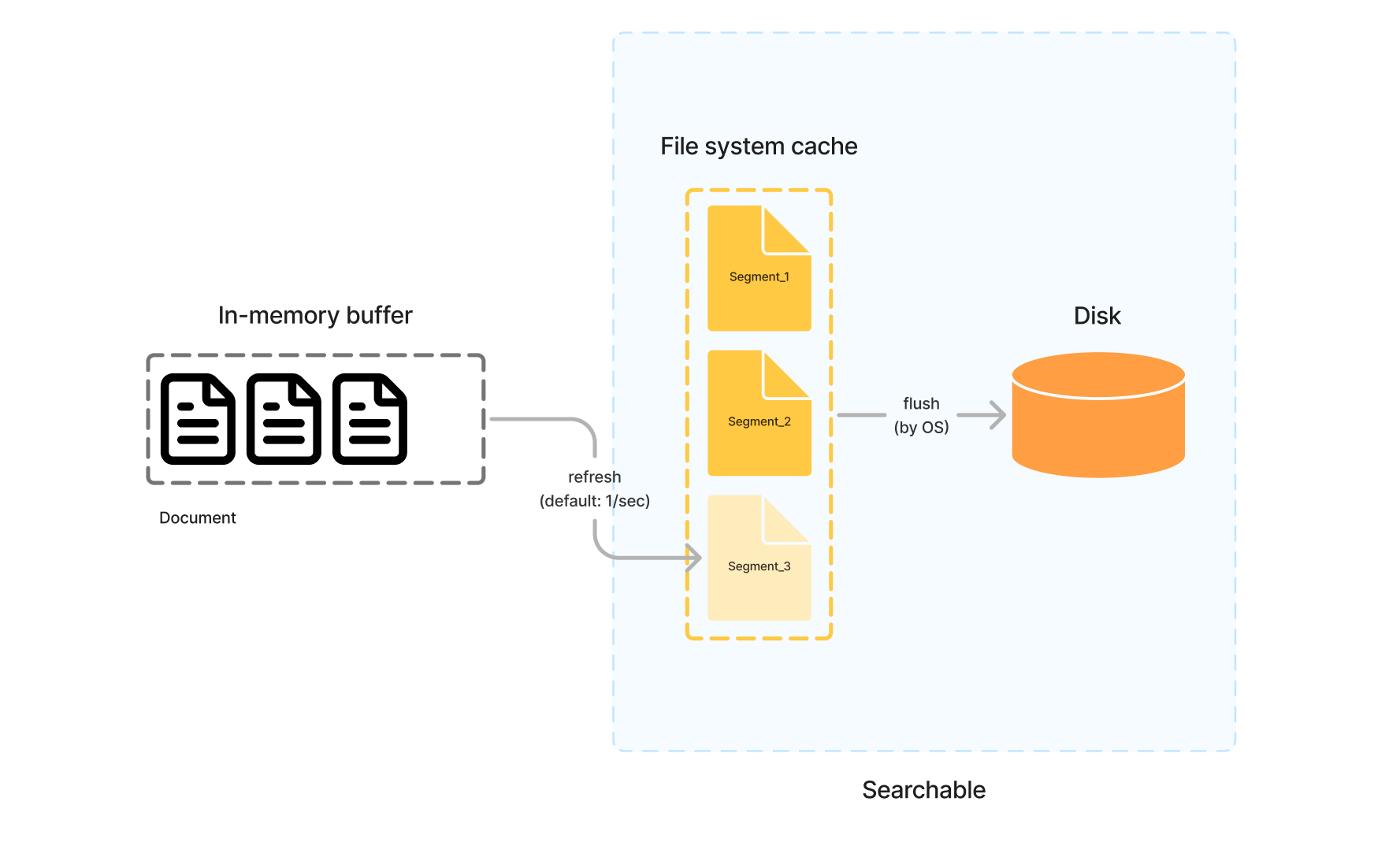 준실시간에 대해 다시 얘기하자면, 새로운 다큐먼트들은 Segment로 저장되기 위해서 우선 In-memory index buffer에 저장되었다가, 작은 Segment로 구성되어 Disk에 기록되기 전에 주기적으로(기본 1초) file system 캐시에 저장되는데, 이 시점부터 다큐먼트는 검색 가능(Searchable)하게 됩니다. 이렇게 Documents가 Segment로 저장하는 것을 refresh한다라고 부릅니다.
