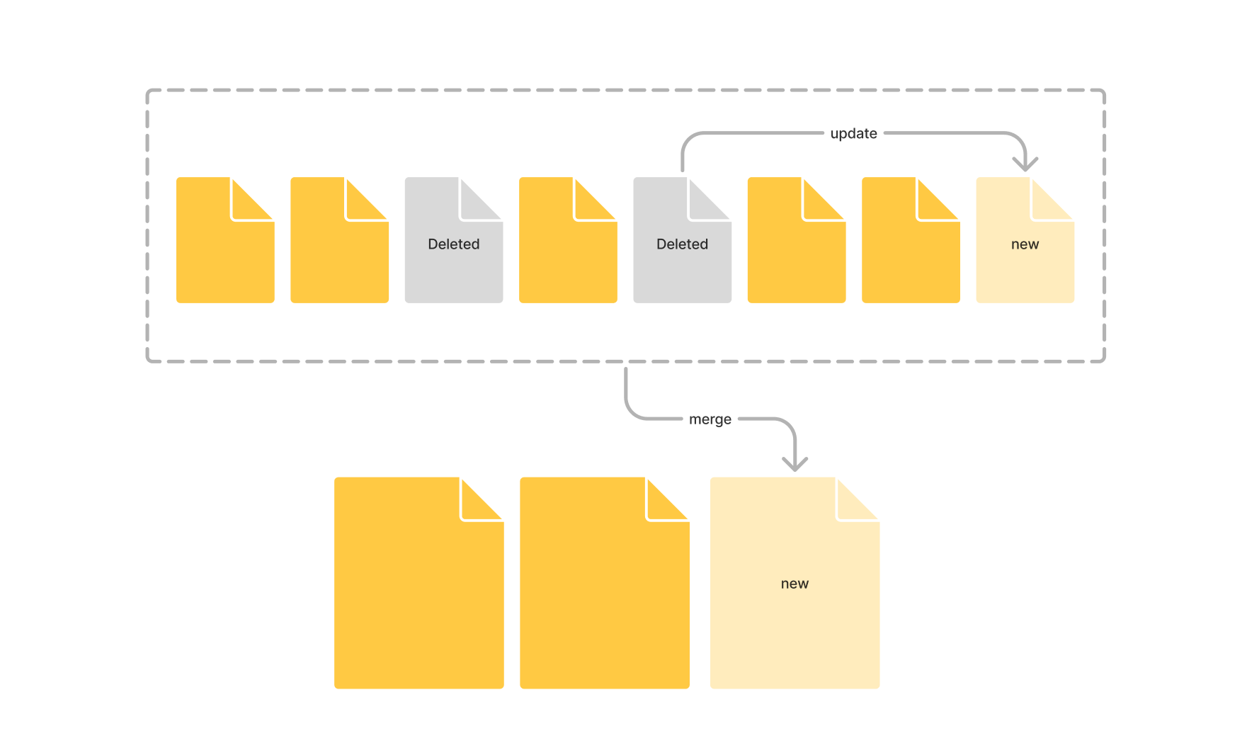 세그먼트는 업데이트나 삭제되지 않고 오직 “생성”만 됩니다. 그래서 세그먼트를 Immutable(불변)하다고 합니다. 기존 세그먼트에 변화가 생기면 commit point를 통해 기존 세그먼트를 삭제되었다 표시(플래그)만하고, 새로운 세그먼트를 생성합니다. 이렇게 하면 세그먼트가 너무 많이 생성되면 데이터 파편화가 생기는데, 이를 위해 Lucene 엔진은 주기적으로 삭제된 세그먼트는 빼고, 유효한 작은 세그먼트들을 모아 더 큰 세그먼트로 만드는 merge 작업을 합니다. 이 merge 작업은 전체 프로세스와는 별개로 알아서 진행됩니다.