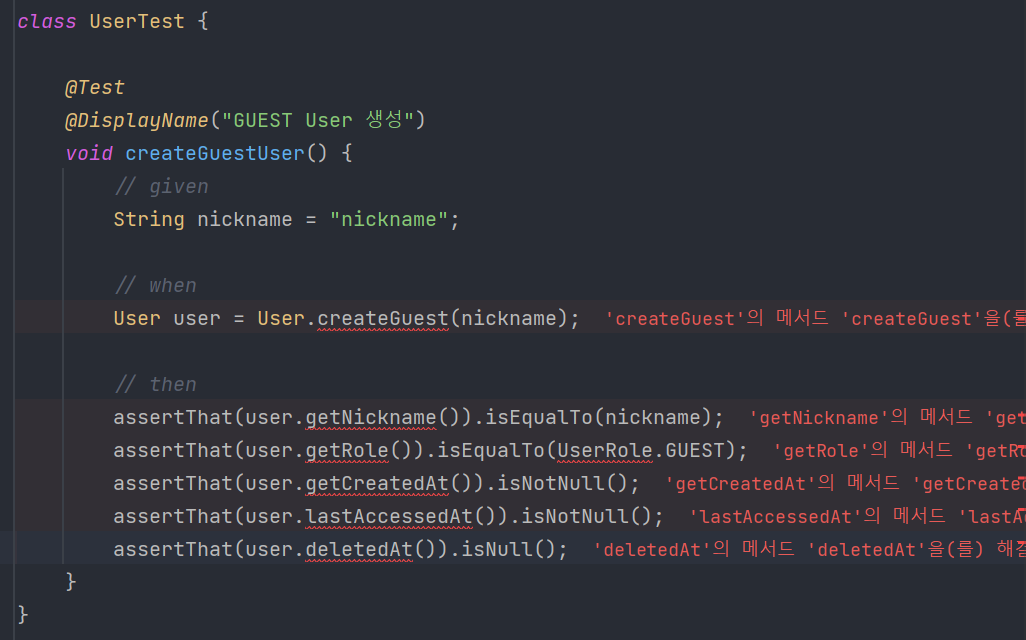 컴파일 에러를 모두 해결했습니다. 하지만 createGuest()가 구현 안 됐으므로 테스트는 통과하지 않습니다. 이제 테스트 통과를 위한 최소 구현을 합니다.
