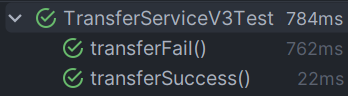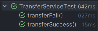 트랜잭션이 적용되지 않은 코드에서는 예외가 발생하는 경우, 비즈니스 로직이 중간에 실패했음에도 보내는 사람(accountA) 돈은 줄어들고, 받는 사람(accountEx) 돈은 그대로인 것을 확인할 수 있습니다. 이는 원자성이 깨진 사례입니다. 이제 TransferService에 트랜잭션을 적용해보겠습니다.