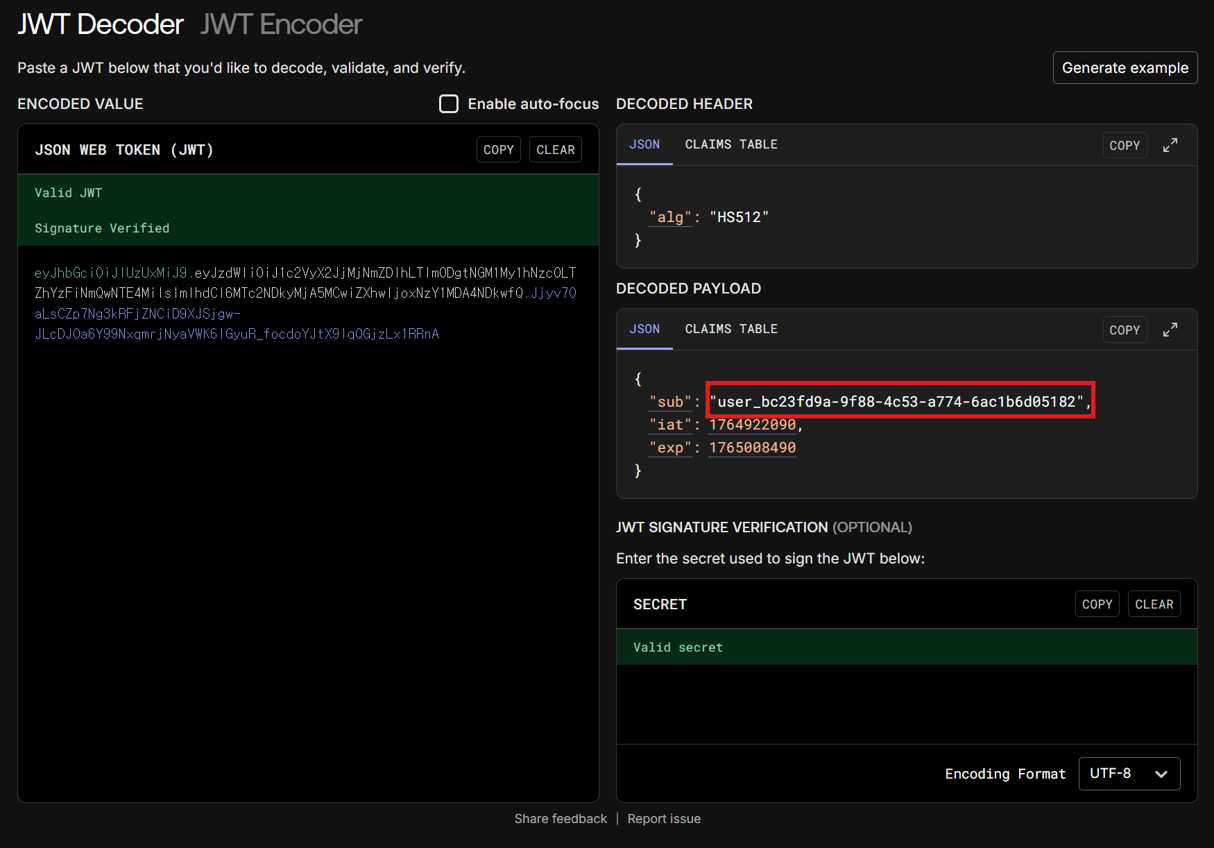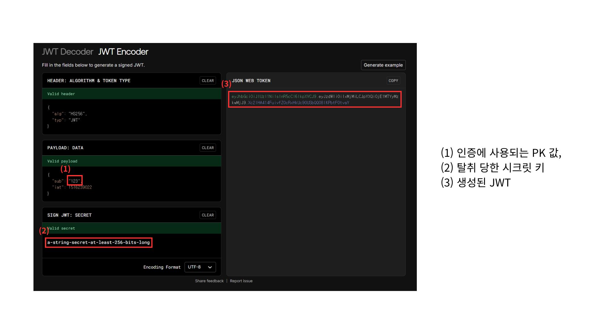 PK 값이 단순 증가값(Auto Increment)라면, 누군가의 ID가 1이면 다음 사람은 2라는 뜻입니다. 서명 키를 알고 있고, 또 내부 데이터 구조를 알고 있는 사람이 있다면, 저 1과 2를, 그리고 높은 확률로 그 뒤에 숫자들도 payload에 담아 서명하면, 실제 사용자에 해당하는 엑세스 토큰이 됩니다. 사용자가 천만 명 2천만 명 된다면, 적당히 1부터 20,000,000까지 모조리 토큰을 만들어서 내 정보 조회 API에 때려보면 DB에 접근 권한이 없어도 거의 모든 데이터를 쉽고 빠르게 얻을 수 있는 것입니다.