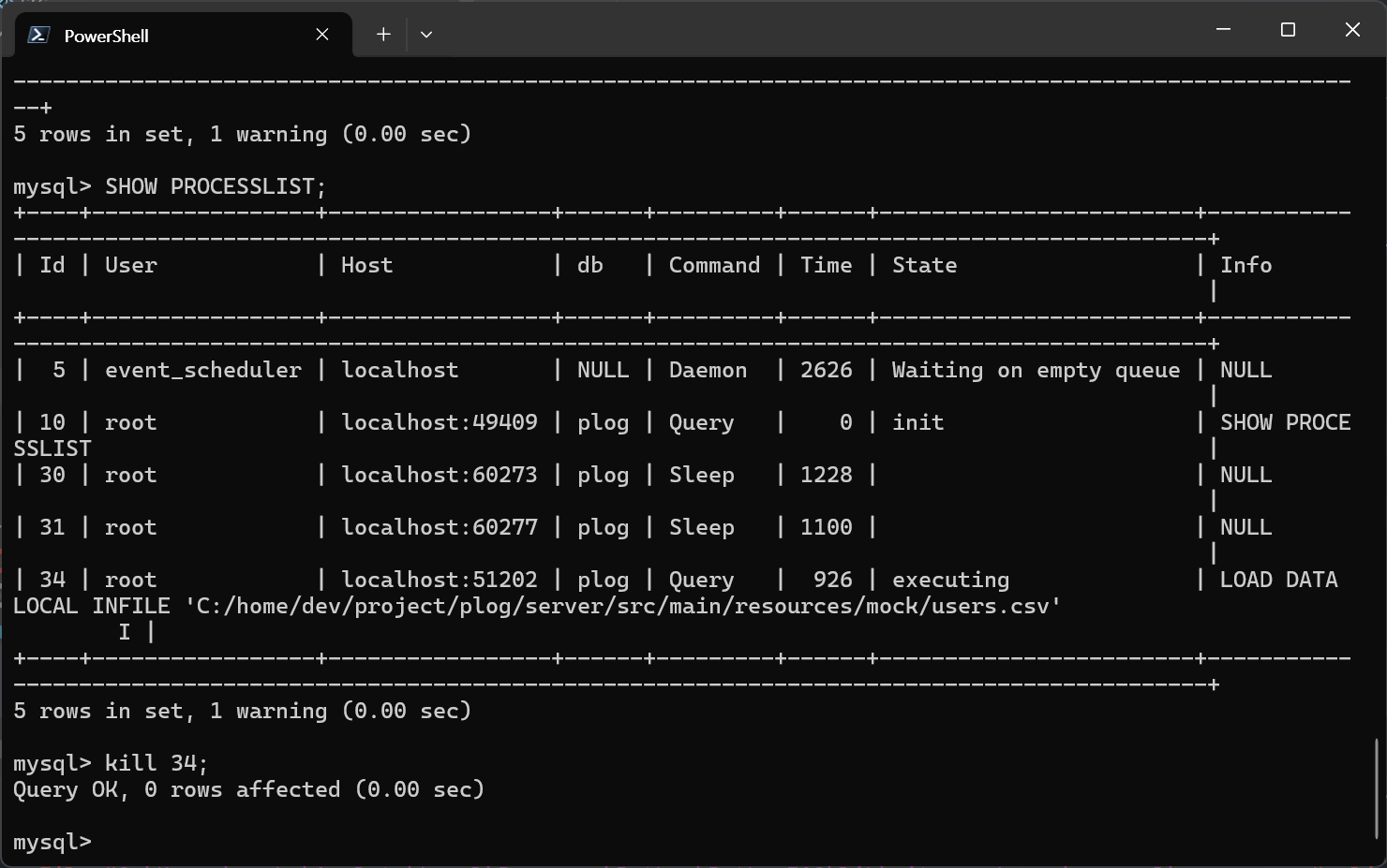 | 579697 | ROLLING BACK | 2025-12-01 21:30:54 | NULL | NULL | 3642417 | 34 | LOAD DATA LOCAL INFILE 'C:/home/dev/project/plog/server/src/main/resources/mock/users.csv'