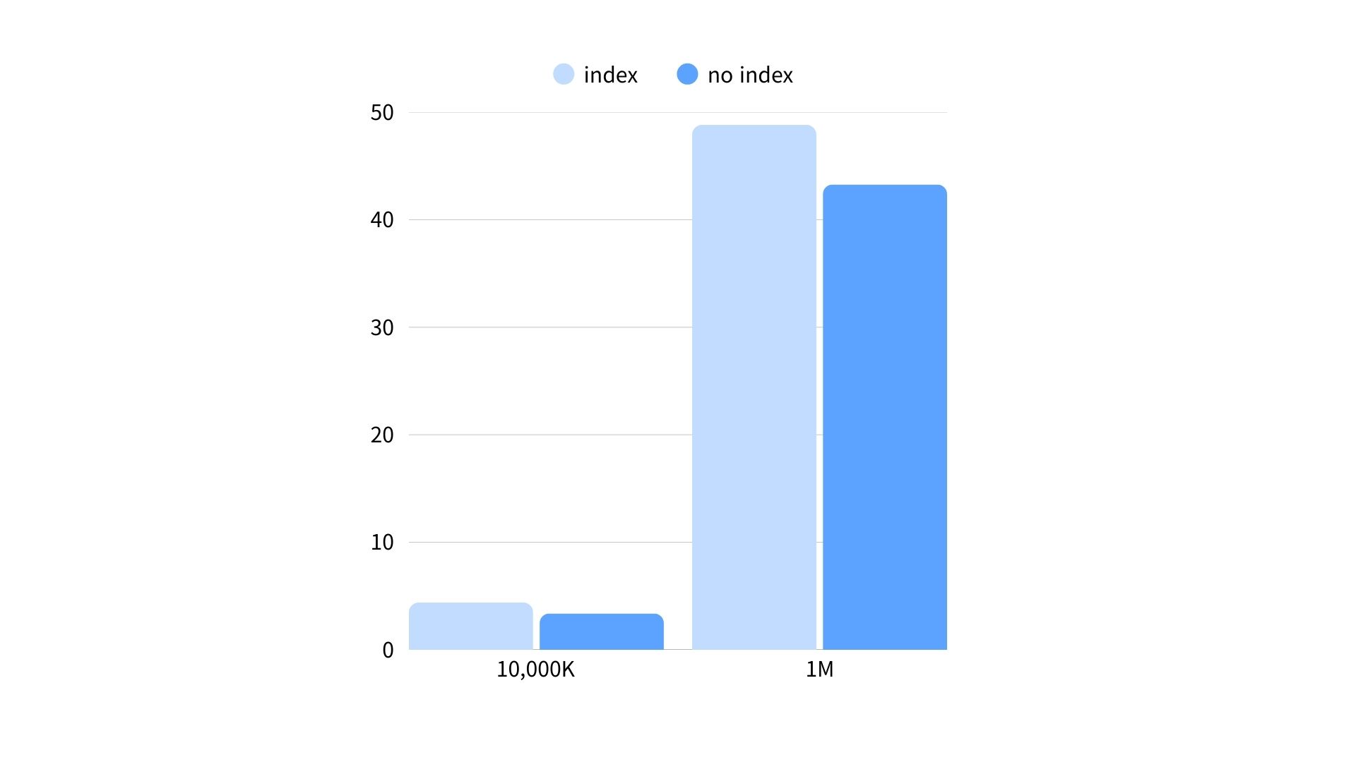 당연한 소리지만 유니크 인덱스가 있으면 삽입 속도가 느려집니다. 유니크 인덱스는 인덱스 생성 비용 이외에도, 값이 존재하는지 유니크 제약 조건을 위한 검사가 한 번 필요하기 때문입니다. 그런데 '대충 느려진다'만 알고 있었지 '얼마나 느려지는지'는 몰랐기 때문에 기록을 해보자면, 다음은 username 칼럼에 대한 유니크 인덱스가 있을 때와 없을 때 데이터 삽입에 걸린 시간 차이입니다.
