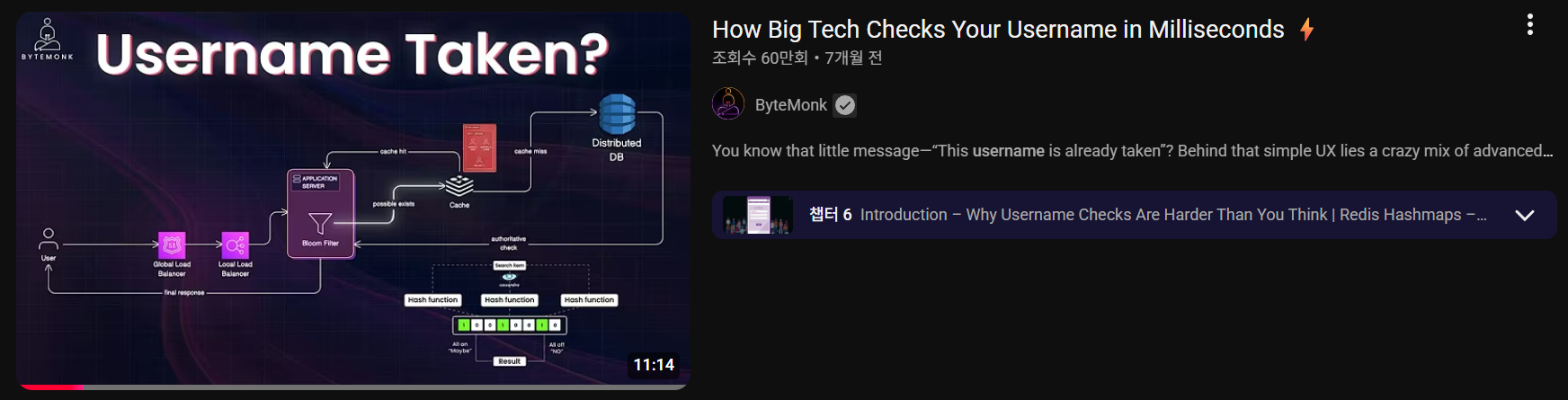 빅테크 기업들은 Username 중복 체크를 어떻게 밀리초 안에 해내는 지에 대한 영상인데, 인덱스 -> 캐시 -> 최종적으로 블룸 필터를 통해서 아주 빠른 속도를 낼 수 있다고 설명하는 영상입니다.