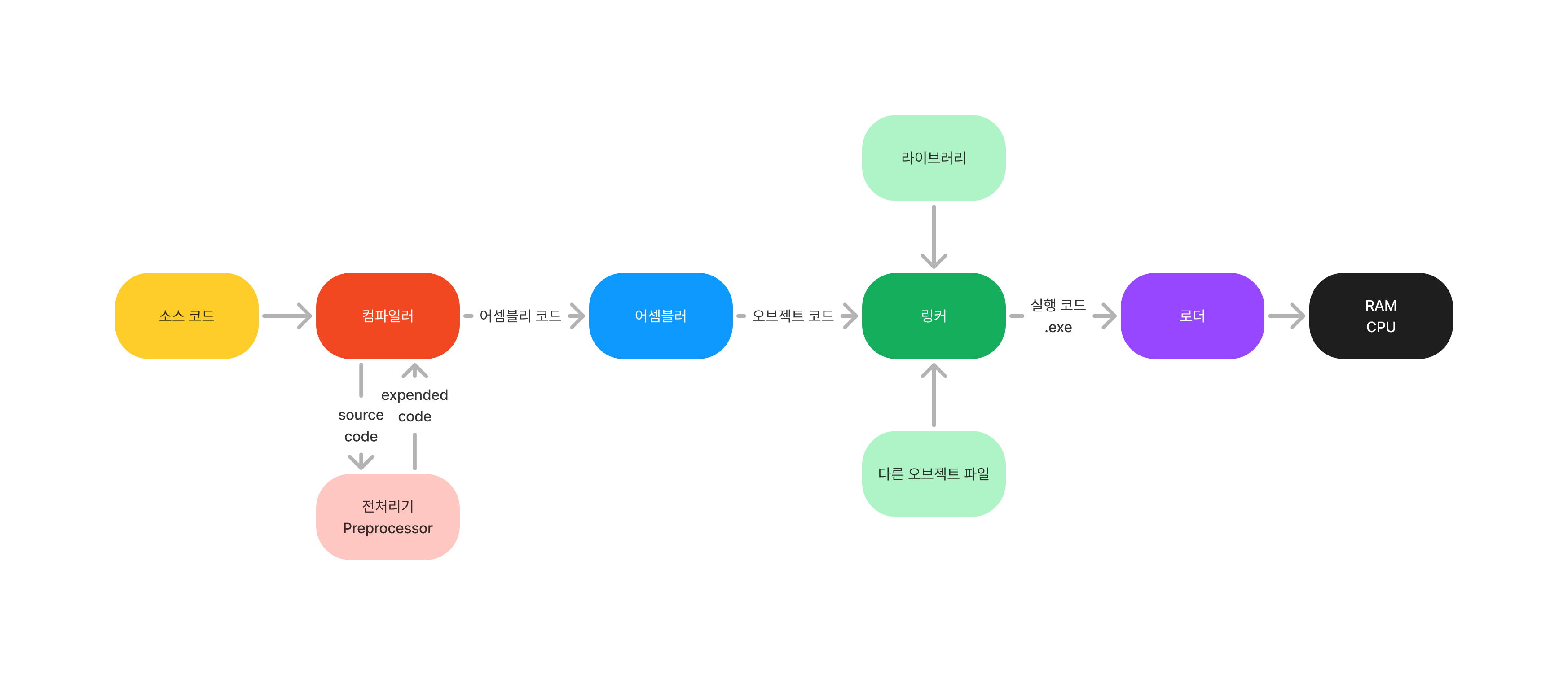 이제 개발자는 현재 기기에 알맞는 컴파일러만 찾아서 컴파일을 시행해주면 된다. 물론 말했다시피 컴파일된 어셈블리어는 해당 컴퓨터 구조의 기능을 담고 있다. 특정 기계를 위해 컴파일 된 프로그램은 해당 기계에서만 실행할 수 있다. 다른 기계를 위해서는 맞는 컴파일러로 다시 컴파일해줘야 한다. 이러한 C언어를 이야기하는 표현이 바로 Write Once, Compile Anywhere이다. 자바는 이 부분에 추상화를 하나 추가한다. 그것이 자바 컴파일러와 JVM이다.
