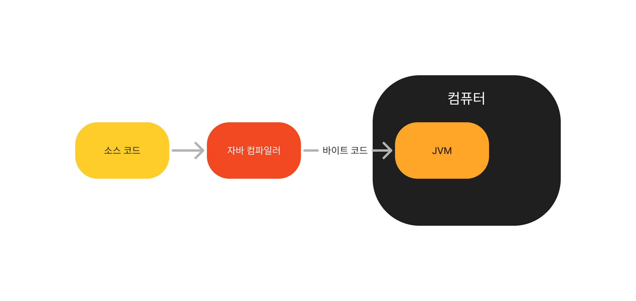 다시 정리하면, 컴퓨터는 JVM을 실행시키며, JVM이 바이트코드를 실행시키는 것이다.
