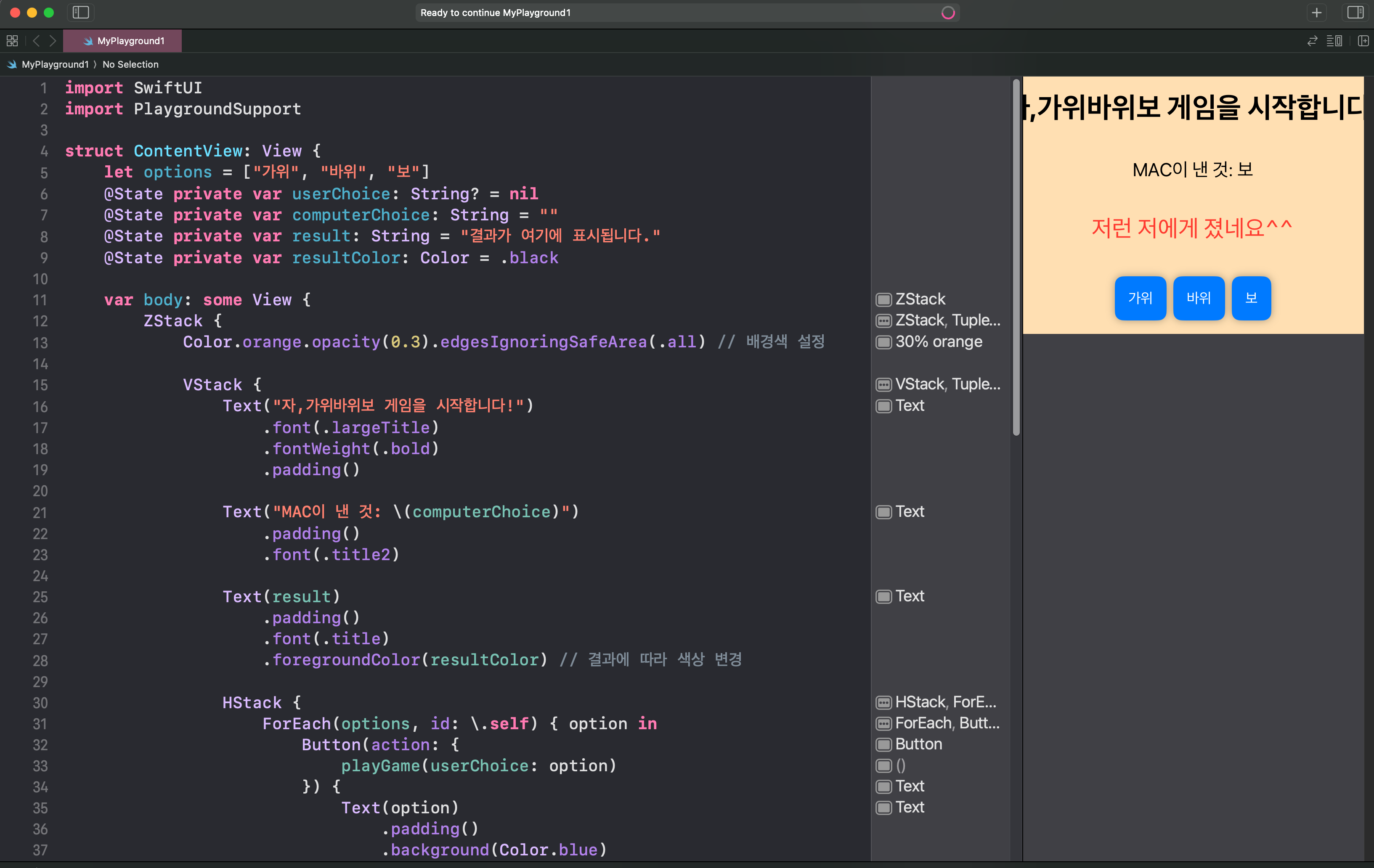 이렇게 각 부분을 하나씩 살펴보면 화면에 텍스트, 버튼, 배경색 등을 구성하고, 사용자의 선택에 따라 게임 결과를 표시하는 로직을 이해할 수 있게 된다. Swift Playgrounds에서 이 코드를 직접 실행해보고 각 부분을 조금씩 변경해 보면서 더 익숙해질 수 있을 것 같다.