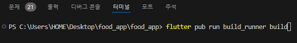 이렇게 작성을 마쳤다면, 터미널에 flutter pub run build_runner build 작성 후 실행시켜 준다.
