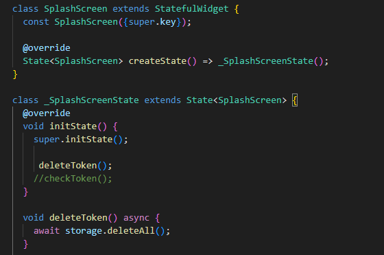 앞선 시리즈에 작성한 splasch_screen.dart 전체 코드에다가 요렇게 추가만 해주면... 토큰이 삭제된다.