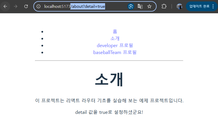 About 컴포넌트에서 location.search 값에 있는 detail이 true인지 아닌지에 따라 추가 정보를 보여주도록 만든다.