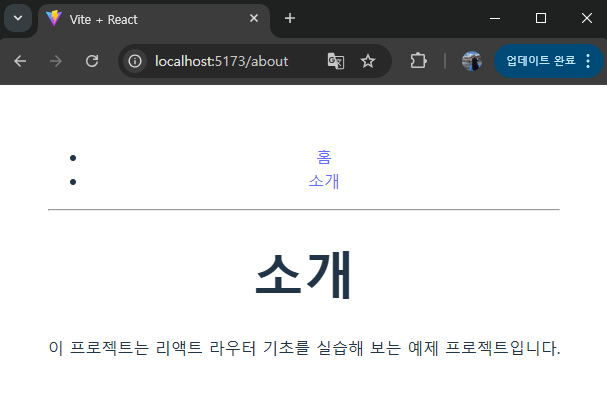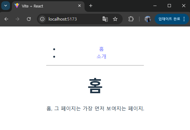 홈이랑 소개 링크 눌러보면 각 페이지로 잘 전환되는 것을 볼 수 있다!