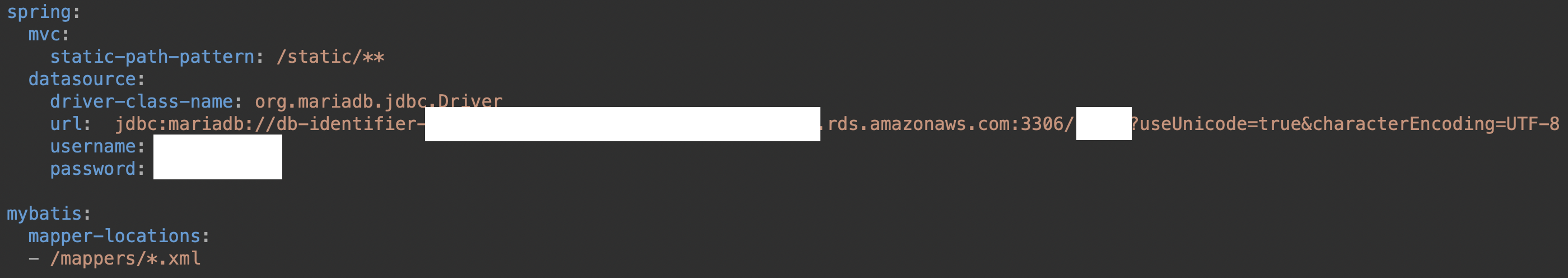 url : jdbc:mariadb:// 엔드포인트 링크:포트번호/데이터베이스명?/useUnicode=true&characterEncoding=UTF-8