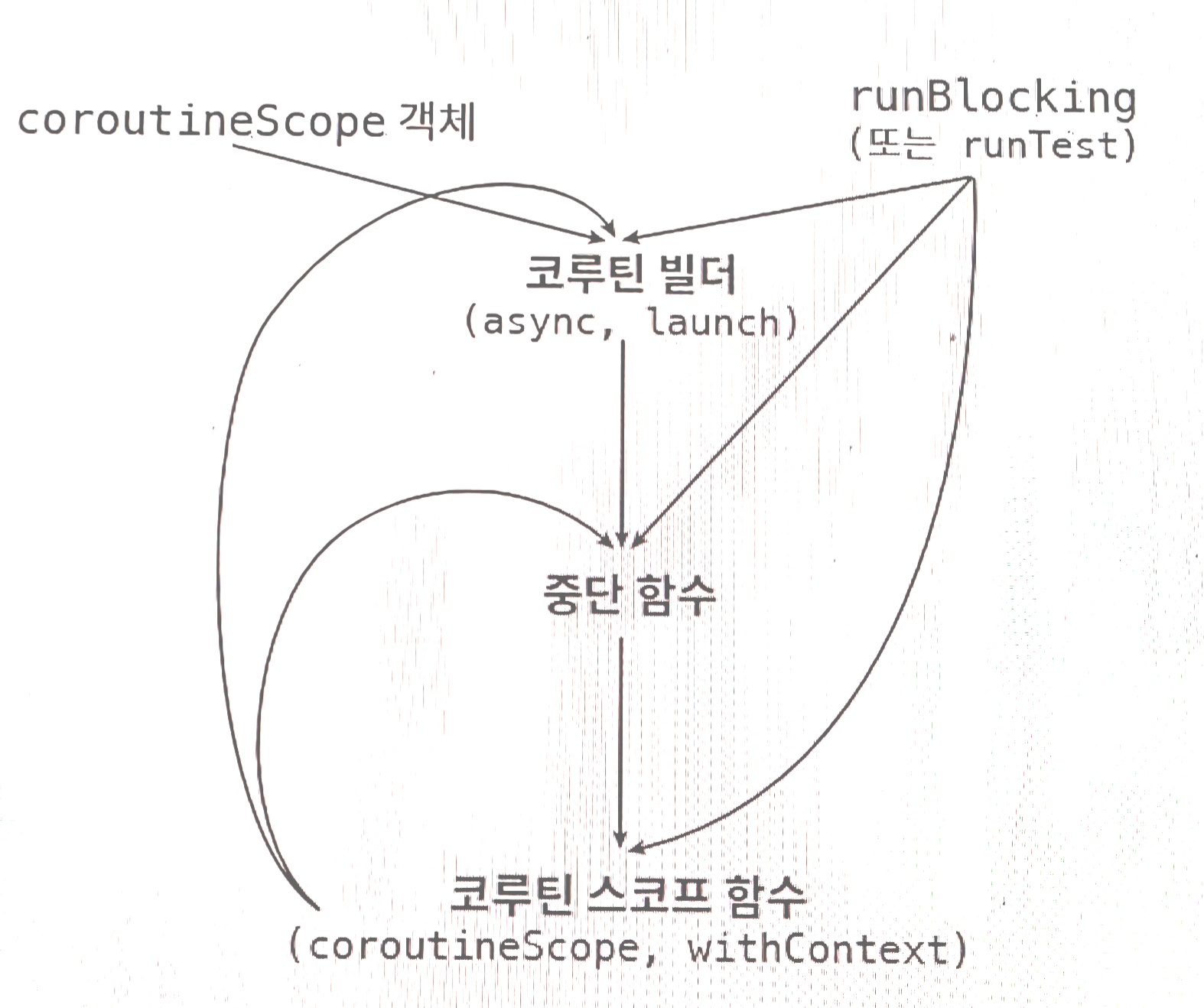kotlinx.coroutines 라이브러리의 요소들이 활용되는 방식을 나타낸 구조도이다. Coroutine은 Scope나 runBlocking에서 시작된다. 이후 타 Coroutine Builder, 중단함수를 호출한다. 중단함수에서 Builder를 직접 실행할 수 없기에 coroutineScope와 같은 Coroutine Scope 함수를 사용하는 것으로 해결한다.