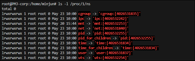 ls -l /proc/1/ns - Init Process NS 확인echo $$ - $$는 현재 사용중인 프로세스 ID를 의미ls -l /proc/$$/ns - 현재 사용중인 쉘의 NS ID 확인bash && echo $$ - 새로운 쉘 실행 및 새로운 쉘 프로세스 ID 확인ls -l /proc/$$/ns - 새로운 쉘의 NS ID 확인==> 위의 과정을 통해 호스트에서는 새로운 쉘을 실행하여도, Init Process와 NS ID가 달라지지 않는 점을 확인 가능합니다.