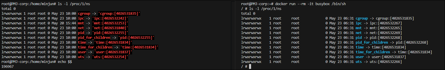 docker run --rm -it busybox /bin/sh - 쉘 사용이 가능하도록 컨테이너 실행ls -l /proc/1/ns - 컨테이너 내부에서 Init Process NS ID 확인==> Host의 Init Process와 Container의 Init Process가 User NS를 제외하면 모두 다른 것을 확인 가능합니다.