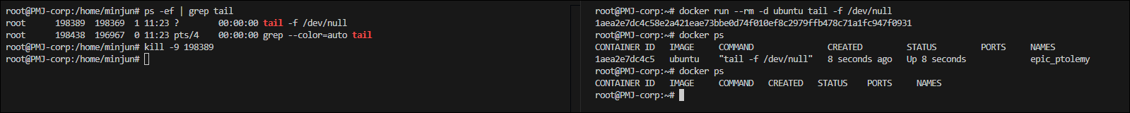 docker run --rm -d ubuntu tail -f /dev/null - 컨테이너에서 tail 명령 실행ps -ef | grep tail - 호스트에서 tail 프로세스 검색docker ps - docker ps를 통해 컨테이너 정상 실행중 확인kill -9 {process_id} - 호스트에서 kill 명령 실행docker ps - 컨테이너가 자동적으로 종료됨을 확인 ==> 호스트의 kill 명령이 컨테이너에 영향을 미침을 확인