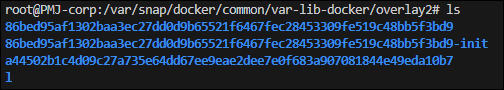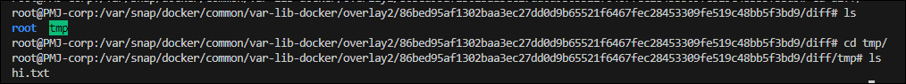 컨테이너를 실행한 터미널은 그대로 둔 상태에서 다른 터미널을 열어, /var/snap/docker/common/var-lib-docker/overlay2 디렉터리로 접근합니다.