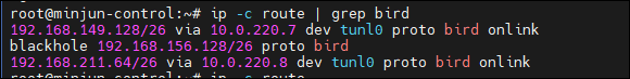 ip -c route | grep bird - bird 관련 라우팅 정보 확인 시, tunl이라는 인터페이스를 확인할 수 있습니다.