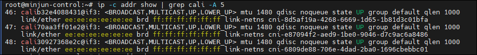 ip -c addr show | grep cali A -5 - calice NIC의 link-netnsid 확인