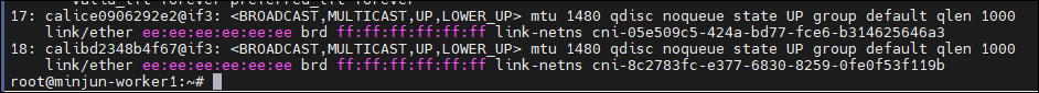 ip -a - (Pod가 생성된 Worker Node에서 실행) - 생성된 Pod 개수마다 calice NIC가 생성되어 매치됨