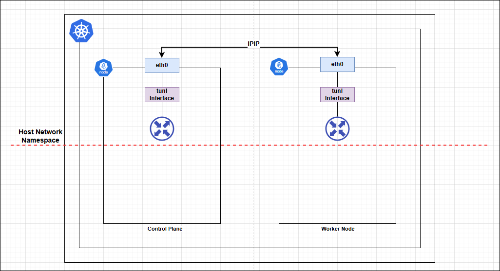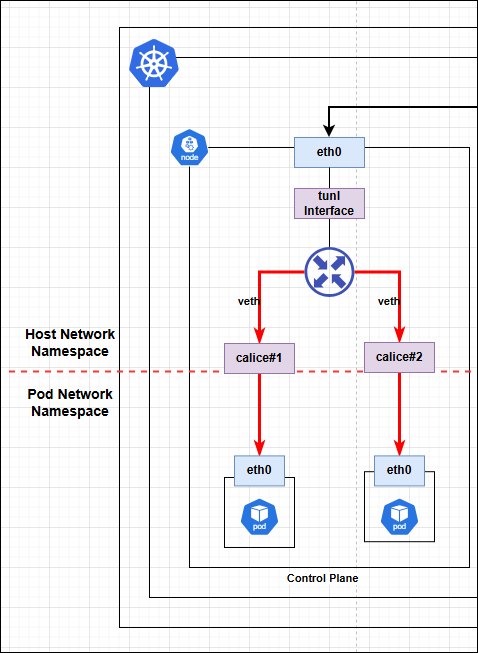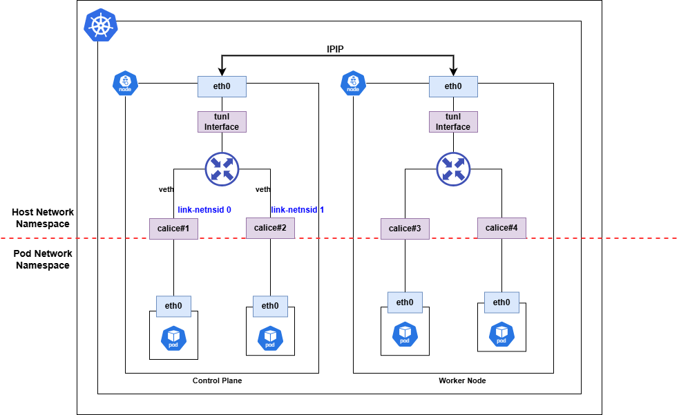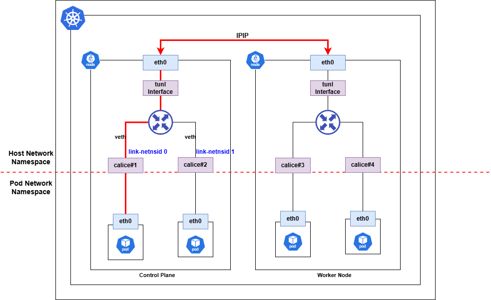 Calico는 Pod-to-Pod 통신을 위하여, tunl NIC가 host 네트워크 네임스페이스(root)에 생성됩니다.