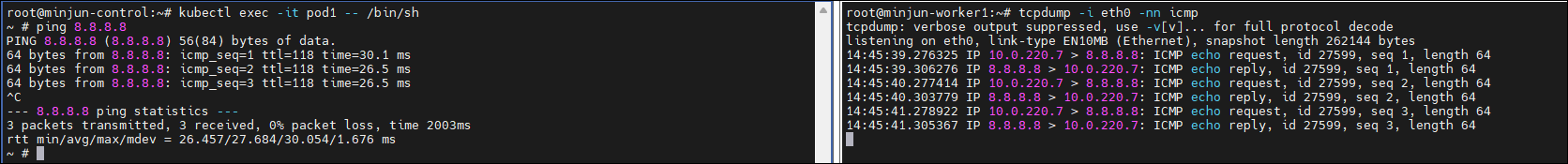 --> 즉, Pod의 IP(출발지 IP)가 eth0의 IP(외부 인터페이스 IP)로 변경된다는 것!