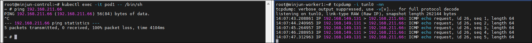 tunl0 인터페이스를 tcpdump를 걸고 확인 시, Pod1 > Pod2로 통신 시에 해당 인터페이스를 거치는 것을 확인 가능합니다.