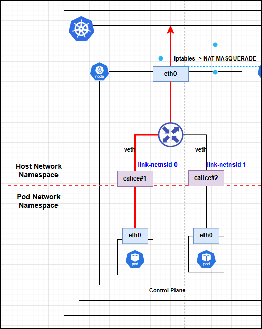 즉, 기본 경로(Default route)는 Pod1 <> Host를 연결하는 veth pair의 반대쪽(host side)로 향하게 됩니다.